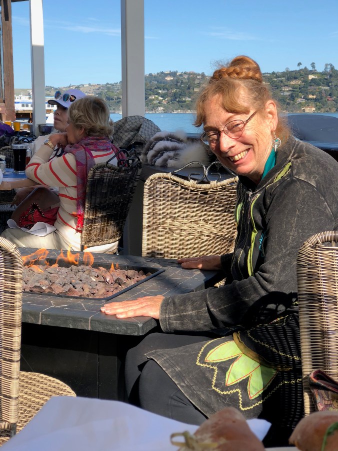 The tour ripped me away from Muir woods and hauled me to Sausalito. A busy little town with lots of tourist stuff and some very nice galleries. We were hungry from being with trees and walked to The Trident restaurant. We got seats overlooking the water. Patsy got by a fire to get warm: