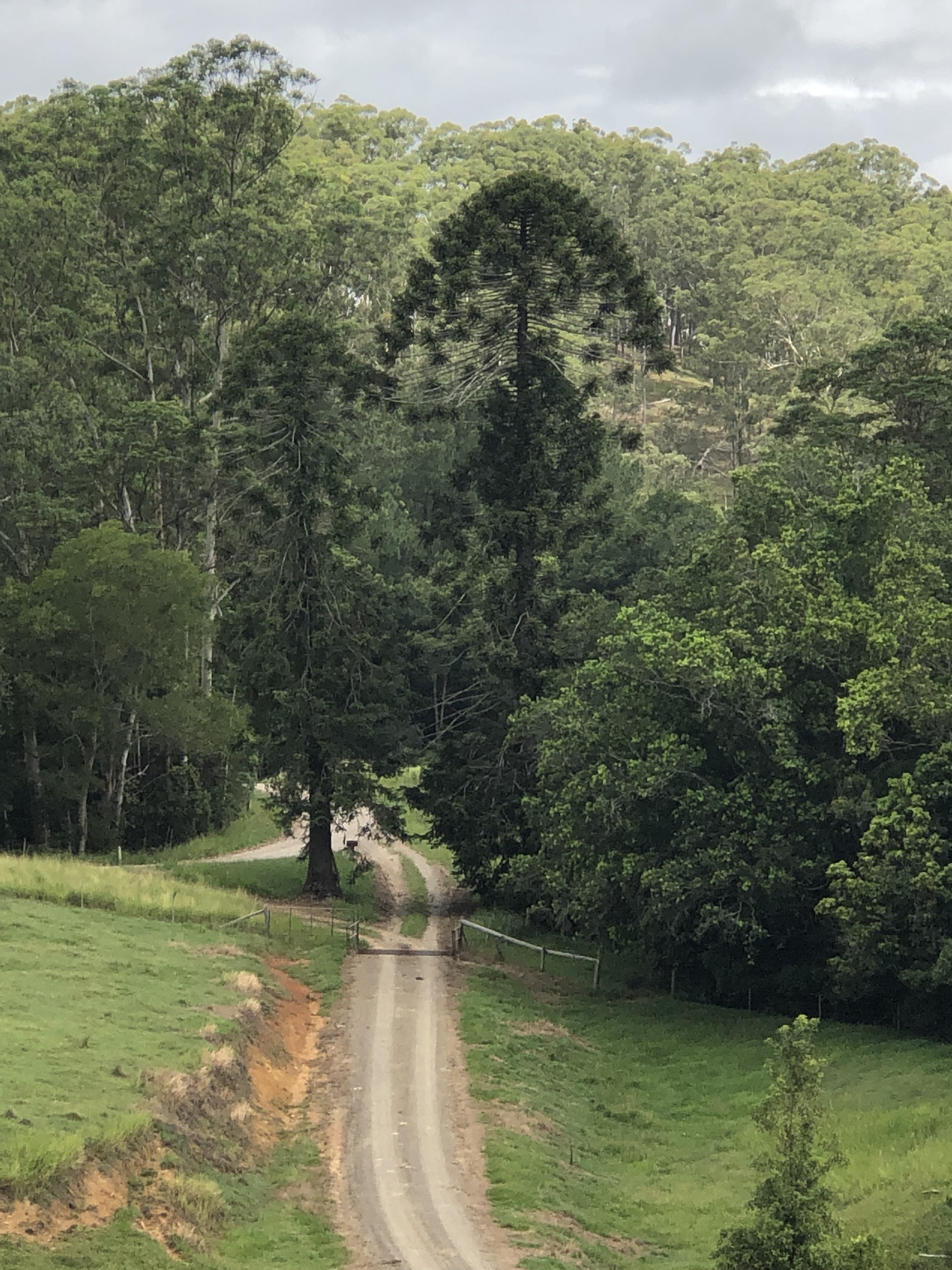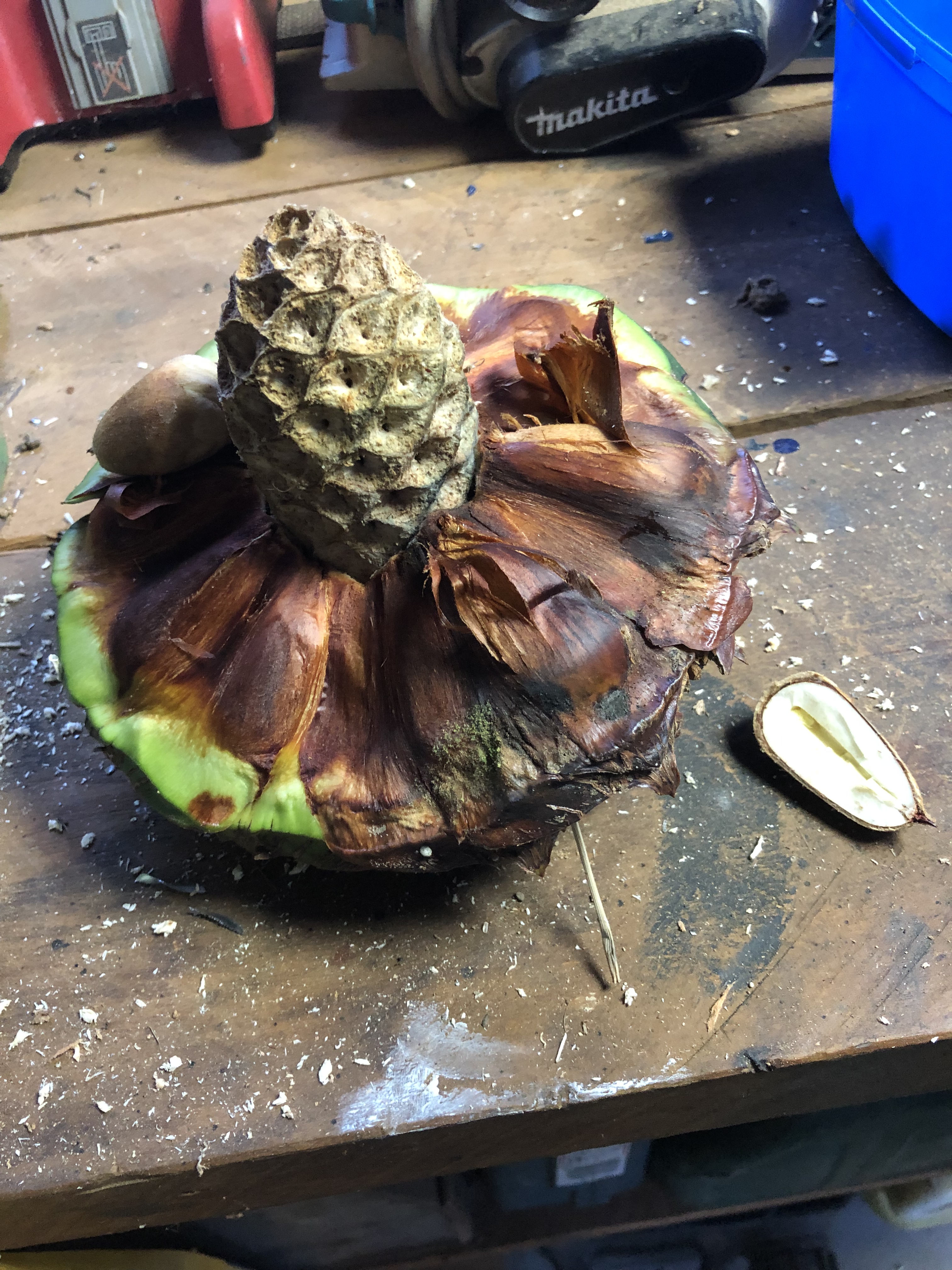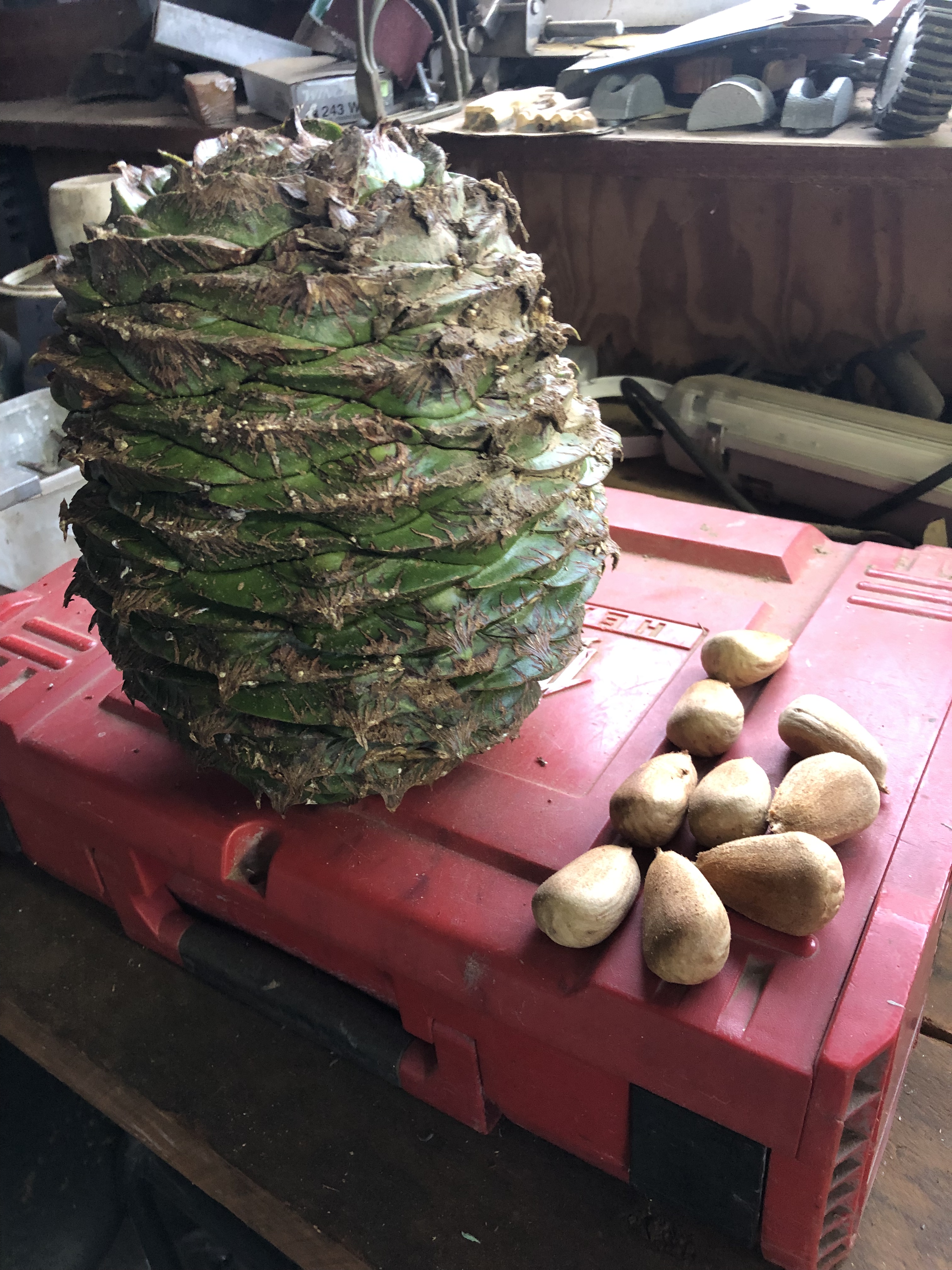 The nuts grow on the tree encased in an oblong globe about the size of my head. They are prolific and nutritious. The Aborigines lite a fire on Candle Mountain to signal when they were ripe. Always excited to try new foods Wally helped me take two of them back to the shop.