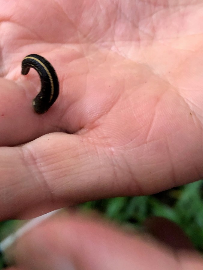 Suddenly Lizzie stopped a said, “He bit me.” She pulled up her pants and pulled a leech from her leg. She carefully rolled him up in her hand and threw him further into the bush.