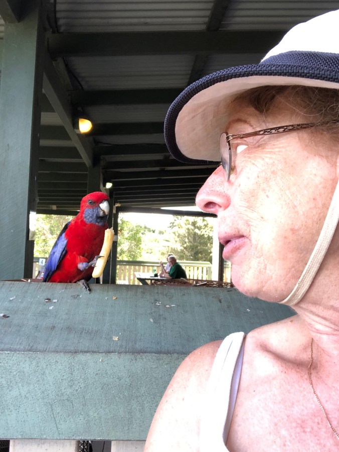 At the cafe I while I was at the restroom a Crimson Rosella came and grabbed one of my chips (French fries) even though Lizzie had tried to protect them. We discussed the situation parrot and I.  I had to agree it was too much starch for me, but I said, “It’s probably not good for you either.” He was so polite I didn’t mind sharing. Holding one chip he sat behind me taking delicate little bites.
