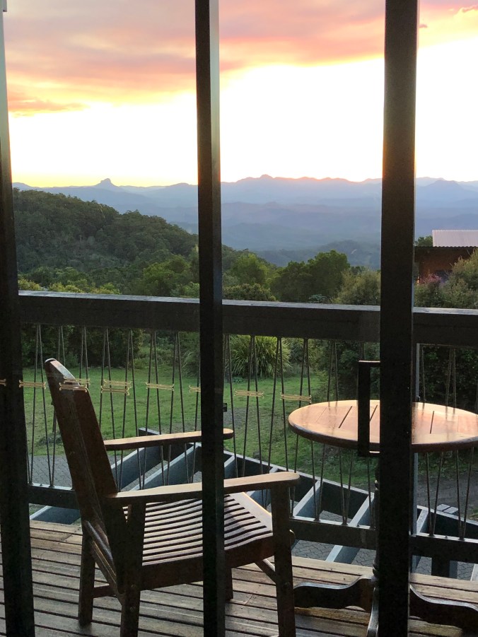 Returning to our room, we planned a hike for the next day.  I was pleasantly surprized at how wonderful I felt from the days hiking.  As we watched the sunset we planned a 10.6 km hike.  The Brochure described the hike:” It is a most rewarding circuit walk.  The track winds down through stands of Brush Box and Picabean Palms to the lush sub-tropical rainforest along Cunungra Creek. Pepper Vines cling to the trees that often support spectacular tree gardens.”  Tune in to O’Reilly’s Day 2 for this adventure.