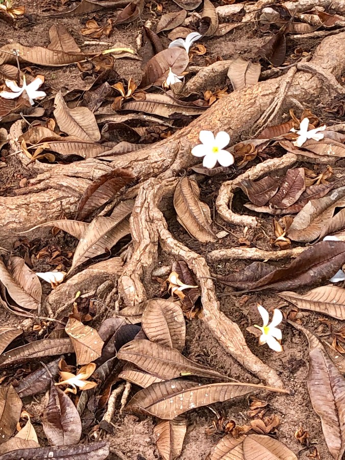 Outside the shop There was a beautiful white frangipani tree. Its fallen blossoms contrasted against the abstract pattern roots.
