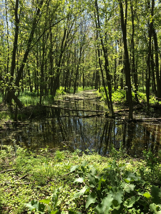 While my eyes relaxed in the subtle spring greens reflecting in the water my ears reached out into the forest hearing the birds calling.