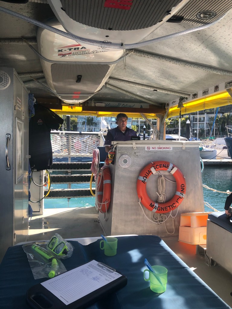 Finally the boat was ready and I got onboard, along with 9 other passengers. There were actually just 5 family groups, and people did do social distancing even though there are only two active cases in all of Queensland. Captain Adam gave us a safety talk and then asked us what we wanted to do for the day. We could sightsee, snorkel, do catch and release fishing, and hopefully see a whale. I was interested in sightseeing and seeing a whale or at least a sea turtle. No one wanted to go fishing, so we would have more time for sightseeing and snorkeling. We had to be back at the dock by 3:00 so some people could catch the ferry back to Townsville.