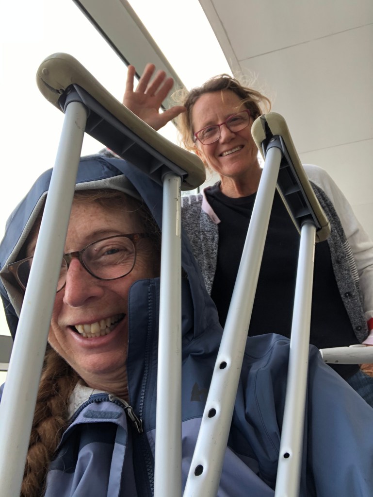 I had to get special papers signed from my doctor saying that I could fly. At the airport, I hopped up to the reservation counter and asked for a wheel chair. They took my signed papers and got me the wheel chair. What a relief to finally sit, it had been a long hop on crutches up to the ticket counter, my friend, Kathy, managing our three suitcases.. Kathy rolled me to our terminal. Getting on the plane was difficult, since most small Australian airports don’t use ramps, you walk up stairs outside to get on the plane. For me the had a special lift that I stood in balancing on my crutches. They didn’t let me take pictures of it.
