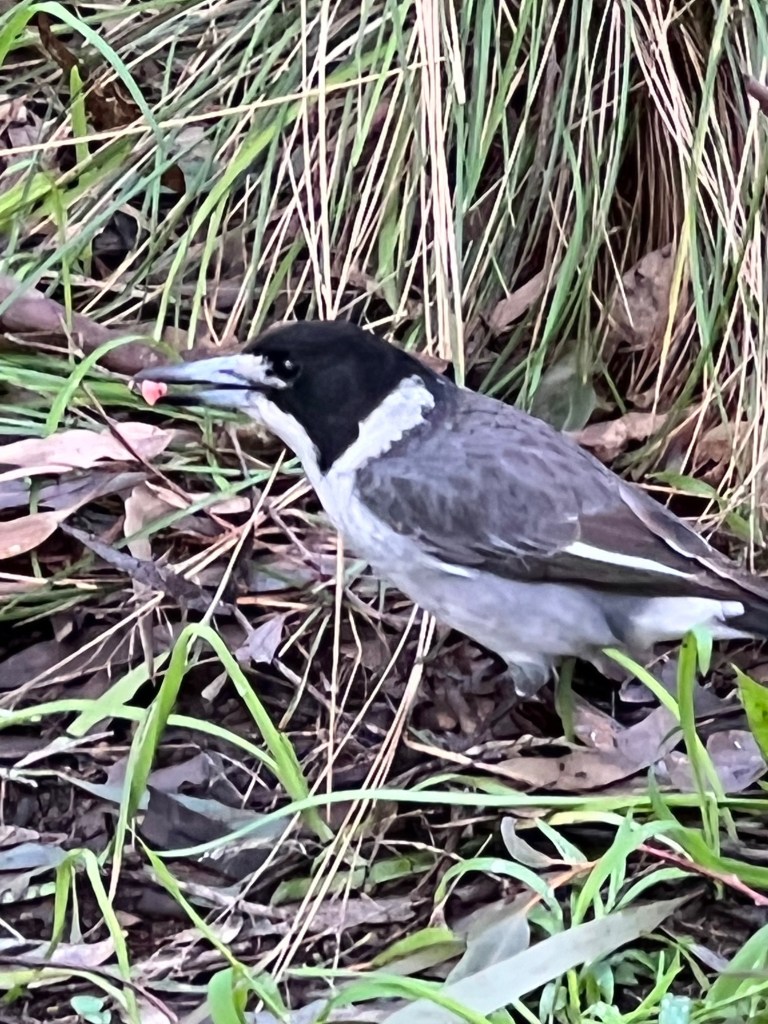 A happy Grey Butcherbird showed up enjoying a morsel I’d uncovered in my weeding.