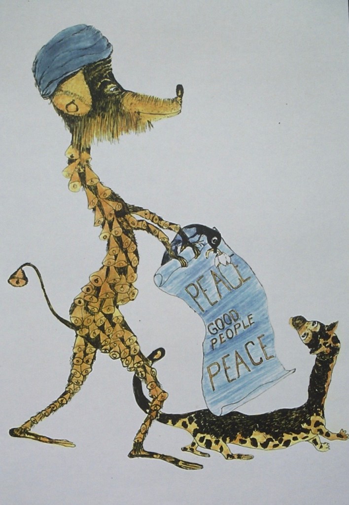 International Bell Dog. Colored ink p. 18. This painting was reproduced by hand on cards Sheila sent out during the Vietnam War. I used it in the book to illustrate her father’s stand against WWI: