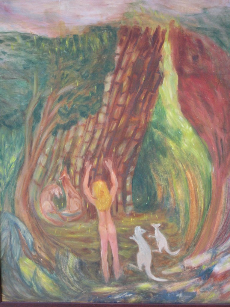 Chapter 3, p 31. Oil on canvas. Australia is know for extremes in weather. In this painting the parent kangaroos are taking refuge in the bush while the little joeys and Sheila are dancing in the rain.