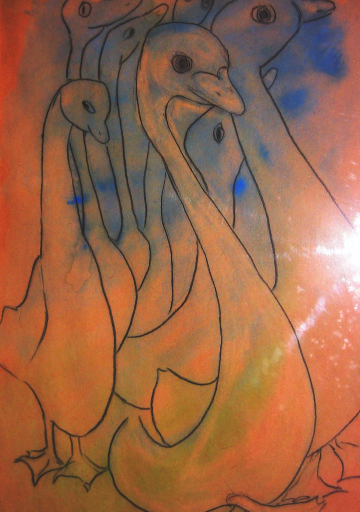 She hopped on a freight train with a hobo, and made it to Grey Eagle, Minnesota, where her cousins lived. Her cousins came down with diphtheria and she was quarantined with the family in her cousin Addie’s house. It was a small house with big yard and a flock of geese. There weren’t any books, no radio even. TV had not been invented. Sheila spent her time getting to know the geese. They humored her, and she trained them to pull a cart. As she told the story she said, “I have no idea how I did that.” Usually Geese at not friendly. Years later she made numerous paintings of geese capturing their motion.