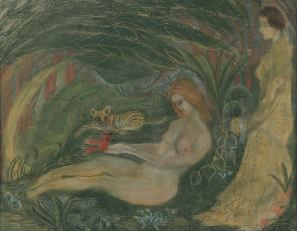 The pastel painting below, was very special. It was completed in the hospital just after Sheila gave birth to her youngest child. The painting represents “Peace”. The standing woman in the long dress represented Sheila’s mother. The naked woman is one with nature at peace the tiger lying down with the naked woman and the pair of birds.