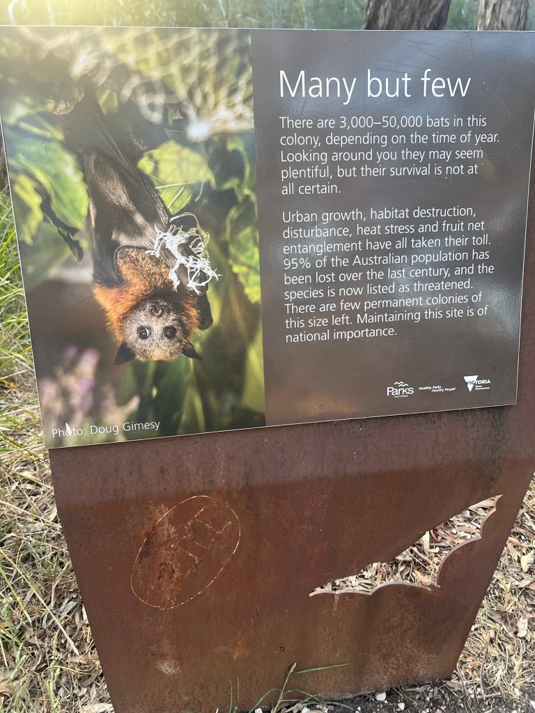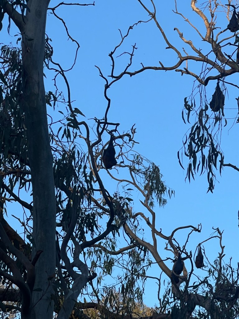 Better than the museums, better than the gallery or even the zoo. Just as exciting as the fairy penguins is seeing the flying foxes take off in the evening. They were close to the Yarra Bend Bellbird picnic site, but they have moved further down the Yarra River, Perhaps to make it harder for humans to bother them, Or maybe they just wanted fresh trees to roost in. After about a kilometer walk down a nice gravel trail we started to see them hanging from the trees like black bags. They were unusually quiet. Occasionally one stretched its wings as it dangled upside down.