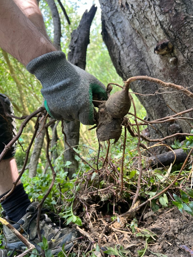 Rambling dock root was tenacious. It took two of us working together to get the tuber out of the ground. The dock will ramble over trees and kill them.