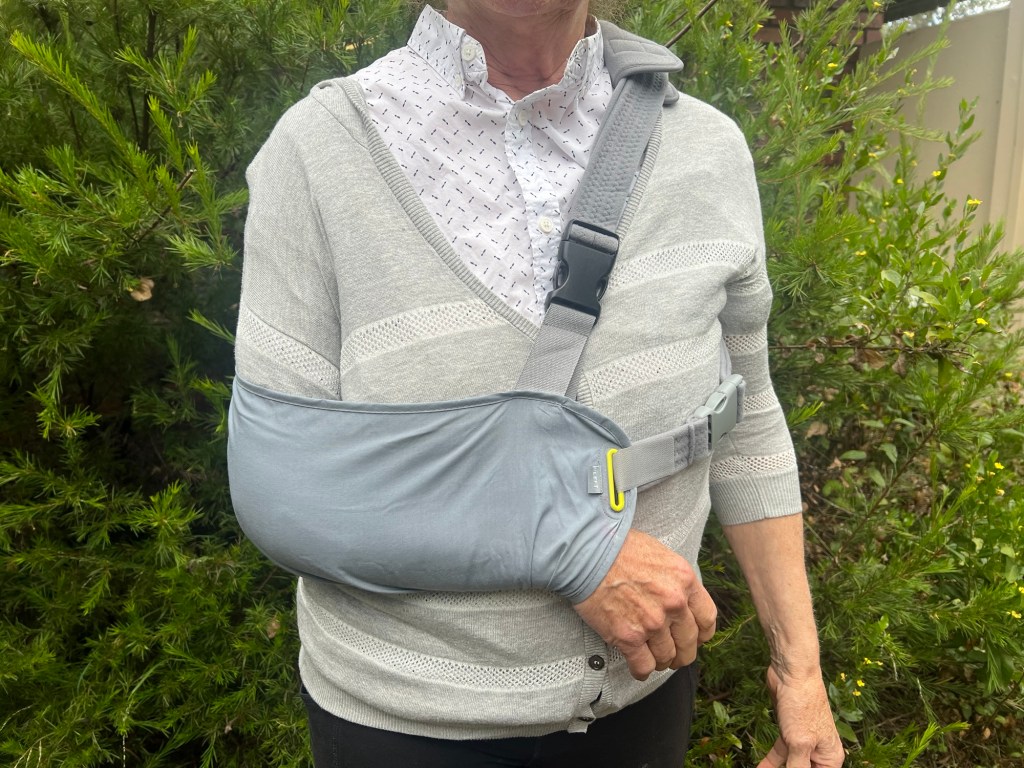 My right arm is in a sling.
